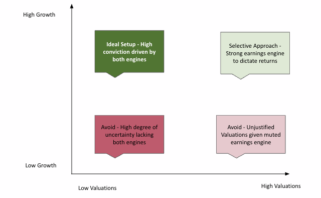 The twin-engine framework simplifies complex changes in diverse business fundamentals, into two quantifiable factors i.e. expected changes in growth & multiples.